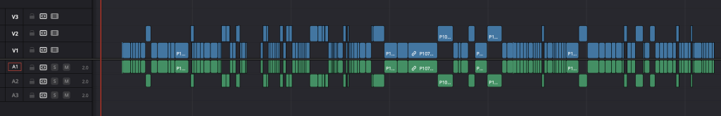 Une fois les premiers tournages effectués, le début du travail de montage peut commencer. Pour cela, Erwan commence par analyser l’ensemble des plans dans l’ordre chronologique de ce qui a été filmé. Et comme plusieurs plans sont souvent filmés pour une même scène, il les classe du plus pertinent au moins pertinent. L’ensemble du montage est effectué sur Davinci, dont l’extrait suivant représente la phase de « dé-rush » que je viens d’expliquer. Les plans sont classés, sur l’axe horizontal, selon l’ordre chronologique, et sur l’axe vertical par ordre de préférence.