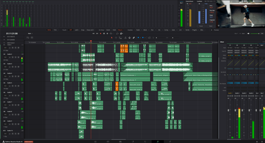 Enfin, la dernière étape du montage concerne le son, étape dite de « sound design ». Cela consiste en l’intégration et l’ajustement des éléments sonores. Cela comprend la musique, les effets sonores. Toujours effectué via Davinci, Erwan utilise des musiques provenant de banques de sons, choisies pour répondre à l’ambiance que nous voulons donner à la vidéo. Pour les bruits d’ambiances, les effets sonores, la difficulté réside dans le fait que personne n’a enregistré l’exact son voulu, donc il faut adapter, par exemple en trouvant un son d’un rocher qui tombe dans l’herbe pour faire un bruit de pas.