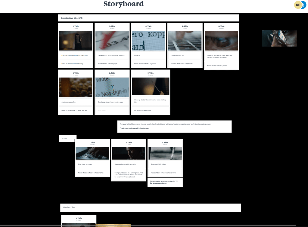 Pour la seconde partie, qui consiste à préparer la retranscription du pitch en vidéo, nous avions quelques éléments que nous voulions voir apparaître, par exemple, un métronome. Mais ce n’est bien sûr pas suffisant. Erwan a donc fait un gros travail de recherche pour identifier des exemples desquels s’inspirer et essayer d’en créer de toutes pièces. Le but ici est d’obtenir un ensemble de scènes et même plus précisément de plans à filmer qui, mis bout à bout, constitueront le cœur de la vidéo. Cela se traduit par un storyboard, créé via Milanote par Erwan.