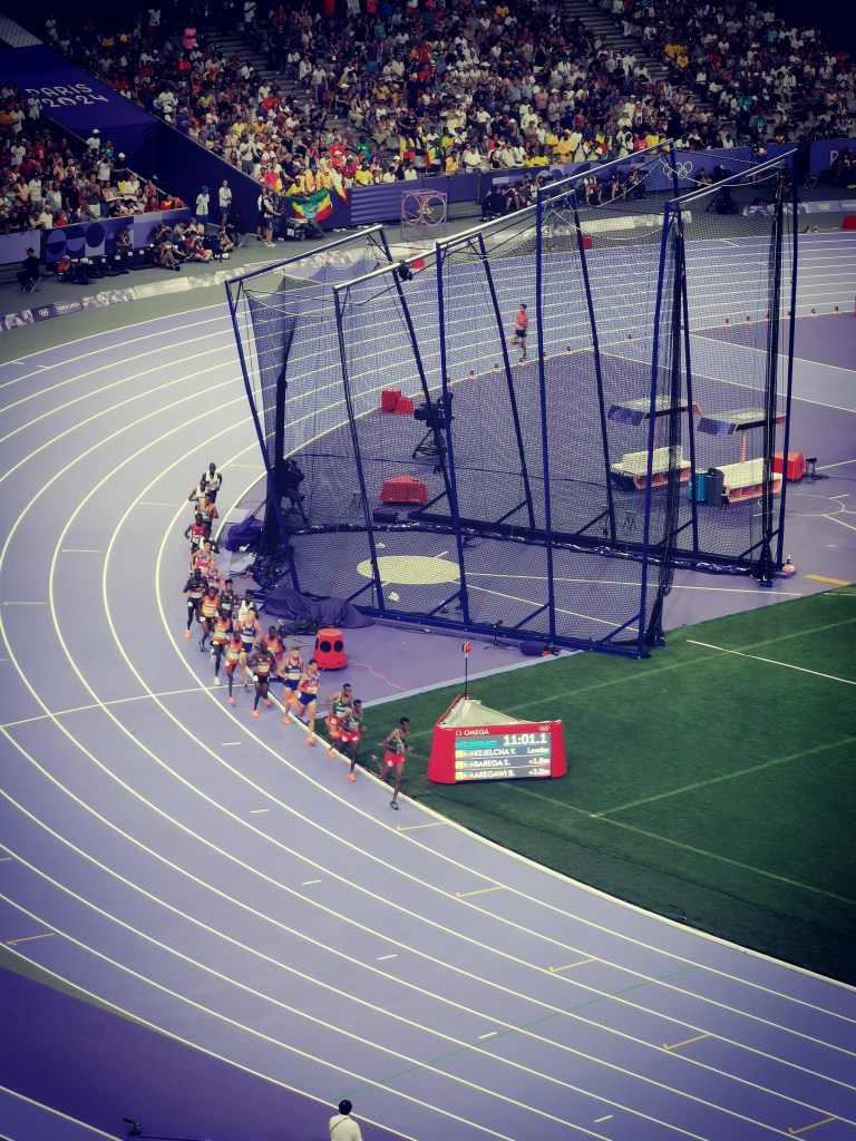Retour au Stade de France, un lieu que je commence à bien connaître. Le décor a changé : les poteaux ont laissé place aux filets de l’aire de lancer, et la piste violette fait son apparition. Pour moi, l’athlétisme est le sport olympique par excellence. Mon intérêt pour ce sport a grandi au fil des années, en particulier grâce à ma pratique de la course à pied, devenue mon activité sportive principale. Je suis donc de plus en plus assidûment les grandes compétitions, surtout les épreuves de fond et de demi-fond.